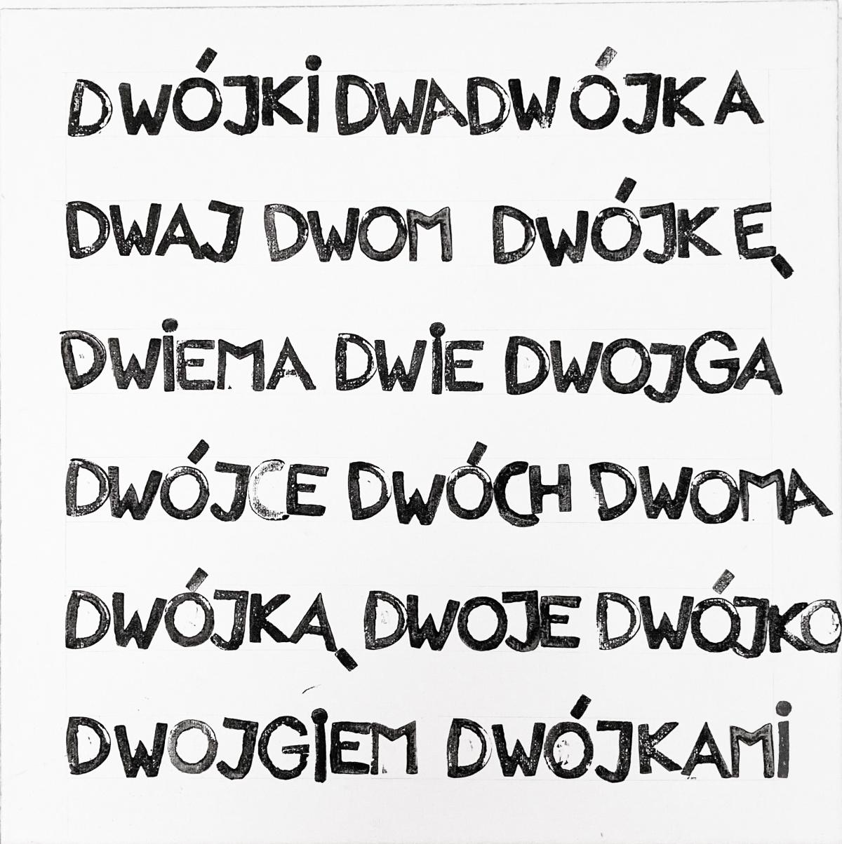 I used potato stamps to illustrate the repeatability and precision of the first part of the word dwa (the same stamps were used each time), while also revealing the individuality of each whole word (since every stamped impression is unique).